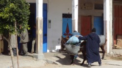 Er rijden heel wat volgepakte ezels, of karretjes en er lopen zeulende mensen op de weg.