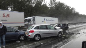 Maar dan……………. Terwijl we met een gangetje van 100 km p/u door kachelen en we door luxe auto’s worden ingehaald, begint er zo’n 50/ 100m voor ons een auto rond te tollen en knalt er één bovenop en nog één en nog enkele. We schrikken ons rot en we kunnen net naast en op de vluchtstrook tot stilstand komen, ook Bert kan op tijd remmen.