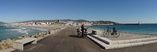 Vooral Willy, die thuis ook al geen schone slaapster is, heeft daar flink last van. Dat is wel ff balen voor haar.Na de lunch van stokbrood met gebakken sardines, trekt de wind weer aan. Het is echt zo’n mistige zeewind. Wat dat betreft hebben we iets minder geluk met het weer, alhoewel het heel wat beter is dan in Nederland. We hebben nog geen regen gehad, er is vaak zon, maar je moet echt uit de wind zitten en in de zon om ervan te genieten. De wind is en blijft te fris voor de tijd van het jaar. Normaal is het een stuk warmer.We besluiten dan ook om deze keer op de camping nog wat te zonnen en daarna naar de grote supermarkt/ winkelcentrum van de Marjane te gaan op de fietsen.Zo’n 6 km van de camping verwijderd kopen we de nodige boodschappen en dat is echt niet veel met al die uit etentjes buiten de deur. We drinken rillend onze afscheidsborrel bij ons restaurantje en gaan verkleumd naar de camper ( zon weg, meer wind….en koud!!!……).Dit verwacht je echt niet in Marokko.