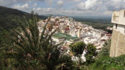 We rijden eerst het witte plaatsje Moulay Idriss in, waar gelijk een man ons allerlei dingen vertelt en ons niet meer uit het oog verliest en bij ons blijft lopen. Hij wijst ons de weg naar een panorama en naar de ronde moskee. We geven hem een gift en bedanken hem voor de informatie.