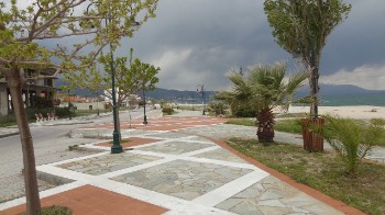 Daarna richting Asprovalta aan zee, waar wat campings moeten zijn. Helaas is het hek nog dicht, maar er zijn plaatsen genoeg om te gaan staan. We kiezen een plek aan een boulevard met palmen en gelijk aan zee. Het weer was zonnig, maar de bewolking en een enkele spat regen komen in aantocht. Het is soms zo donker, dat de zee donkergroen kleurt.