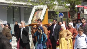 23 april. Van Asprovalta naar Keramoti Vanmorgen behoefte aan een korte wandeling. We lopen door het dorp en horen in de buurt van de kerk muziek. We komen te weten, dat er rond 11.00u een processie zal zijn na de kerkdienst ter ere van St George. We overleggen met onze vrienden,die doorgaan om te vogelen bij een paar Lagunes. Wij blijven wachten op de processie en gaan daarna door naar Kavala om dat te bekijken. Onderweg zien we bij een lagune nog honderden flamingo's