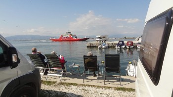Wij rijden daarna met een grote boog naar Igoumenitsa, waar we gezellig op een terras koffie drinken. Behulpzame Grieken maken we de eerste dag in dit land al mee. Sjaak krijgt hulp van een ober, die rijdt met zijn auto naar een winkel, die de spullen verkopen voor de afvoer van de vuilwatertank. Helaas zijn ze pas na 18.00u open. Op de camping gaat de behulpzaamheid nog een stukje verder. Hier vragen ze, wat hij allemaal nodig heeft en een uur later komen ze langs met de auto en wordt alles geleverd. Zelfs de kosten mag Sjaak niet volledig betalen en een fooitje al helemaal niet.