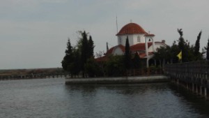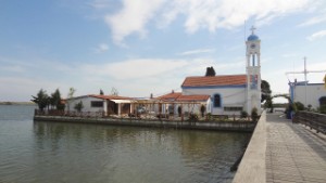 Hier is alweer een vogelgebied, want Porto Lagos ligt precies op een landstrook tussen de zee en het Vistonidameer. We vinden een goed berijdbare weg tussen het Meer door, waar we Flamingo’s, reigers, steltkluten en sternen e.d. zien. Daarna bezoeken we het klooster Nikolaos aan de oever van het Meer en een Grieks Orthodox kerkje over bruggetjes. Het ziet er weer prachtig uit binnen. We branden weer twee kaarsjes en hopen dat het mag helpen voor Kobie en Wil. We gaan naar het haventje van Porto Lagos, waar we overnachten.