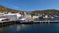 We rijden de hele route langs fjord Portalen, en het is de moeite waard. Het gaat eerst over de E 6 en daarna over de E 69. We moeten door verschillende tunnels en zoals de anderen weer niet best van verlichting. De nieuwe Nordkapp tunnel gaat iets beter, maar ook niet super. Deze tunnel is 7 km lang en ruim 212 m diep, waar ze 6 jaar aan gebouwd hebben. In 1999 was hij klaar, hiervoor moest je met een boot. Sinds 1 juli 2012 is hij tolvrij. Na de tunnel breekt de zon door. We bezoeken na de tunnel de mooie vissersplaats Honningsvag. Honningsvag is de noordelijkste stad van het Europese vasteland