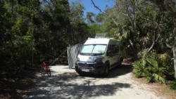 Gelukkig hebben ze plaats. Het ligt op een eiland, omgeven door bruggen, middenin de bossen. Ook alle camperplekken zijn omgeven door bomen, struiken en palmen. Dat betekent weinig wind en flink warm. We verkennen als eerste het mooie witte strand met lage duintjes, waar je km's ver kunt lopen, wat we ook een paar keer doen. Heerlijk