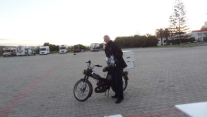 Vooral Willy, die thuis ook al geen schone slaapster is, heeft daar flink last van. Dat is wel ff balen voor haar.Na de lunch van stokbrood met gebakken sardines, trekt de wind weer aan. Het is echt zo’n mistige zeewind. Wat dat betreft hebben we iets minder geluk met het weer, alhoewel het heel wat beter is dan in Nederland. We hebben nog geen regen gehad, er is vaak zon, maar je moet echt uit de wind zitten en in de zon om ervan te genieten. De wind is en blijft te fris voor de tijd van het jaar. Normaal is het een stuk warmer.We besluiten dan ook om deze keer op de camping nog wat te zonnen en daarna naar de grote supermarkt/ winkelcentrum van de Marjane te gaan op de fietsen.Zo’n 6 km van de camping verwijderd kopen we de nodige boodschappen en dat is echt niet veel met al die uit etentjes buiten de deur. We drinken rillend onze afscheidsborrel bij ons restaurantje en gaan verkleumd naar de camper ( zon weg, meer wind….en koud!!!……).Dit verwacht je echt niet in Marokko.