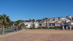 Je waant je ergens in zuid Europa en niet in Marokko, alleen door de kleding van de moslima’s merk je dat je in Marokko bent. Het is een heel gezellige drukte en werkelijk een prachtige, goed verzorgde boulevard. Je kunt er op terrassen zelfs bier en wijn drinken, wat we dan ook doen, want het is super mooi weer. De ober slooft zich uit en komt met olijven en fruit bij de borrel. |