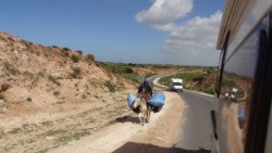 Er rijden heel wat volgepakte ezels, of karretjes en er lopen zeulende mensen op de weg.