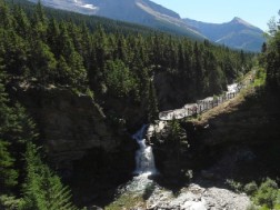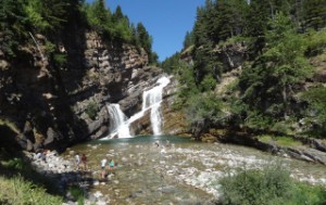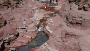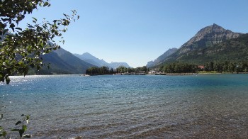 Ook hier is het erg druk en is er geen plaats genoeg op parkeerterreinen. We rijden verschillende toertjes, eerst naar het plaatsje Waterton, waar hertjes lopen en naar het Waterton Lake en een waterval, dan naar Cameron Lake en tot slot naar de Red Rock Canyon met waterval
