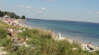 Daarna verder naar het eiland, waar nog steeds leden van de eerste volken van meer dan 10.000 jaar geleden, wonen. De volgende dag doen we een rondje over het eiland. Het is veel rijden en weinig zien. Een paar dorpen zijn wel aardig, nl Little Current en Gore Bay en de waterval bij Kagawong. We rijden zuidwaarts naar Providence Bay met het grootste strand. Ha, eindelijk eens een lekkere strandwandeling maken, denken we.Nou nee dus, geen strandwandeling. Er liggen verspreid wat zandhopen, waar je via een boardwalk kan komen en dat zijn de kleine strandjes dan. (Wat zijn wij in Zeeland verwend met onze kilometers lange stranden). Bovendien wordt het net frisser, dus drinken we koffie en gaan verder. Wij vinden het geen eiland om aan te bevelen, wel nog een hertje en een paar grote vogels gezien.
