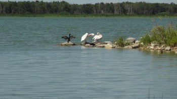 via Dauphin gaat het naar de camping We staan een paar dagen aan het Lake Manitoba, waar we gezellig met een stel uit Winnipeg 's avond een drankje drinken bij het vuur, uit eten gaan en waar Sjaak een paar uur mee gaat vissen. De vissen, die gevangen worden zijn voer voor de witte Pelikanen, die hier leven.