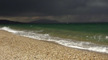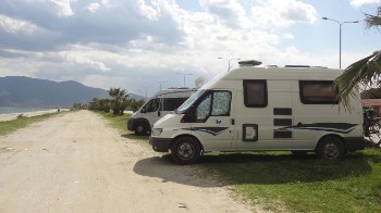 Daarna richting Asprovalta aan zee, waar wat campings moeten zijn. Helaas is het hek nog dicht, maar er zijn plaatsen genoeg om te gaan staan. We kiezen een plek aan een boulevard met palmen en gelijk aan zee. Het weer was zonnig, maar de bewolking en een enkele spat regen komen in aantocht. Het is soms zo donker, dat de zee donkergroen kleurt.