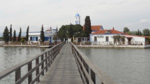 Hier is alweer een vogelgebied, want Porto Lagos ligt precies op een landstrook tussen de zee en het Vistonidameer. We vinden een goed berijdbare weg tussen het Meer door, waar we Flamingo’s, reigers, steltkluten en sternen e.d. zien. Daarna bezoeken we het klooster Nikolaos aan de oever van het Meer en een Grieks Orthodox kerkje over bruggetjes. Het ziet er weer prachtig uit binnen. We branden weer twee kaarsjes en hopen dat het mag helpen voor Kobie en Wil. We gaan naar het haventje van Porto Lagos, waar we overnachten.