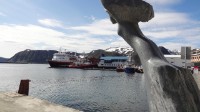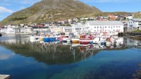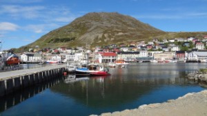 We rijden de hele route langs fjord Portalen, en het is de moeite waard. Het gaat eerst over de E 6 en daarna over de E 69. We moeten door verschillende tunnels en zoals de anderen weer niet best van verlichting. De nieuwe Nordkapp tunnel gaat iets beter, maar ook niet super. Deze tunnel is 7 km lang en ruim 212 m diep, waar ze 6 jaar aan gebouwd hebben. In 1999 was hij klaar, hiervoor moest je met een boot. Sinds 1 juli 2012 is hij tolvrij. Na de tunnel breekt de zon door. We bezoeken na de tunnel de mooie vissersplaats Honningsvag. Honningsvag is de noordelijkste stad van het Europese vasteland