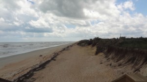 Eerst wou Sjaak nog met de camper over het strand, maar bedacht zich. We fietsen weer over het keiharde zand.Dat het hard is, merk je goed als je erop gaat liggen.