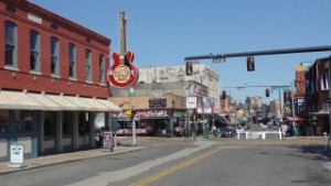 De bekendste straat is de Beale Street en tevens het uitgaanscentrum. We begrijpen nu, dat de trolley pas om 18.00u van de camping vertrekt. Er is geen kip te beleven, zelfs niet in de bekende Beale Street.