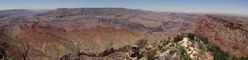 Hij is niet voor niks GRAND, want is 349 km lang, 6 tot 29 km breed en meer dan 1500m diep. Er tussendoor loopt de Colorado River. Hij heeft steile hoge kliffen temidden van rotsformaties in allerlei kleuren. Het is adembenemend om hier rond te lopen met al die dieptes en geweldige kleuren. We genieten er 3 dagen van: de eerste dag als we de Grand Canyon binnen rijden met de auto vanaf de Desert View Watchtower tot ongeveer het Visitor Center , dag 2 en 3 lopend en mbv shuttles. Aan de foto 's kun je zien, hoe geweldig het hier is. Overdag is het erg warm, rond de 35 gr of meer zelfs. 's Nachts koelt het af naar 10 tot 15 gr, heerlijk!