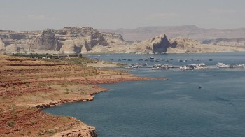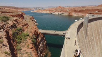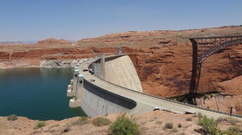 We bekijken de Glen Canyon Dam, gaan langs het Lake Powell, dat prachtig blauw is. Er is zelfs een strandje, de Wahweap Beach, waar je kunt zwemmen. Rechtsomkeer gaat Sjaak terug om zn zwembroek en neemt een duik in Lake Powell. Heerlijk met die hitte!