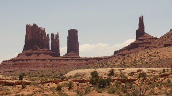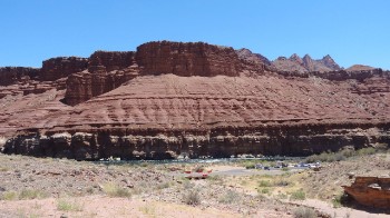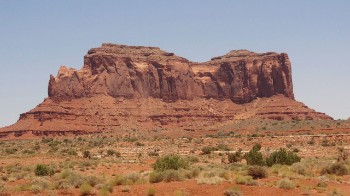 Omdat we niet met eigen camper de route binnen het Park mogen doen, maken we hem langs de highway, langs route 163. Er doemen verschillende donkerrode rotsformaties op en je kunt ze van vele kanten fotograferen, wat we dan ook doen. Het Park ligt in Utah, waar de tijd een uur vooruit gaat. In Bluff, waar we overnachten, halen we een temperatuur van 45gr. We zijn die extreme hitte nu wel een beetje beu, dus slaan we Canyonlands over, dat verderop ligt, want ook daar is het boven de 40gr.
